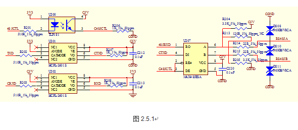 RS485通信接口采用高速光耦進(jìn)行隔離,穩(wěn)定通信波特率最高可達(dá)38.4K,并通過瞬態(tài)抑制二極管對接口做了過壓保護(hù),如圖2.5.1所示。