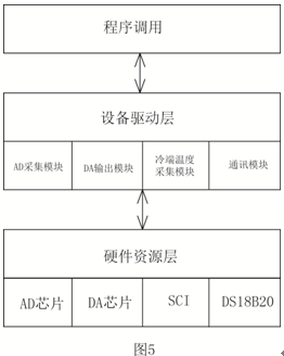 采集板數(shù)據(jù)驅(qū)動程序包括AD采集模塊、DA輸出模塊、冷端采集模塊、通訊模塊等,不同的模塊在程序中有各自的頭文件和源文件,采用模塊化結構的模塊可以提高代碼的重用率,只要修改少量代碼就可以完成程序的移植,在程序中只需要調(diào)用各公共的接口函數(shù)就能對設備進行操作,這樣一來系統(tǒng)軟件的層次分明,便于維護和調(diào)試。