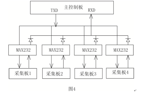 主控制板與采集板之間的通信電路采用主從總線拓撲結構,以主控制板為主機,采集板為從機,每塊采集板的通信接口與RS232芯片連接,為防止輸出端電平相互影響,在從機的發(fā)送端和主機的接收端之間串入一個二極管。為保證機和從機正常的傳送數(shù)據(jù),需要有一套完整的信息傳輸模式,數(shù)據(jù)格式以及內(nèi)容的規(guī)約協(xié)議。主機向所有從機發(fā)送帶地址信息的指令報文,被尋址從機根據(jù)指令報文中功能碼做出應答或動作,每個從機都有各自的獨立的地址,主機向從機發(fā)送的各種指令報文和從機所發(fā)的報文都是以從機的地址為開頭的,從機只讀取發(fā)給自己的指令,對以其它從機開頭的報文不做應答。