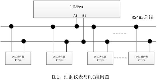 本文利用標準的MODBUS RTU通訊協(xié)議與 RS-485通信指令,方便的實現(xiàn)與多臺虹潤NHR系列儀表的串行通信.成功的實現(xiàn)了用單臺控制器對多臺儀表的靈活控制??删幊炭刂破髟试S在一個RS-485通信接口上連接多達100臺虹潤儀表,儀表大于60臺時,需加一個RS-485中繼器,RS-485通信口通信距離長達1KM以上。