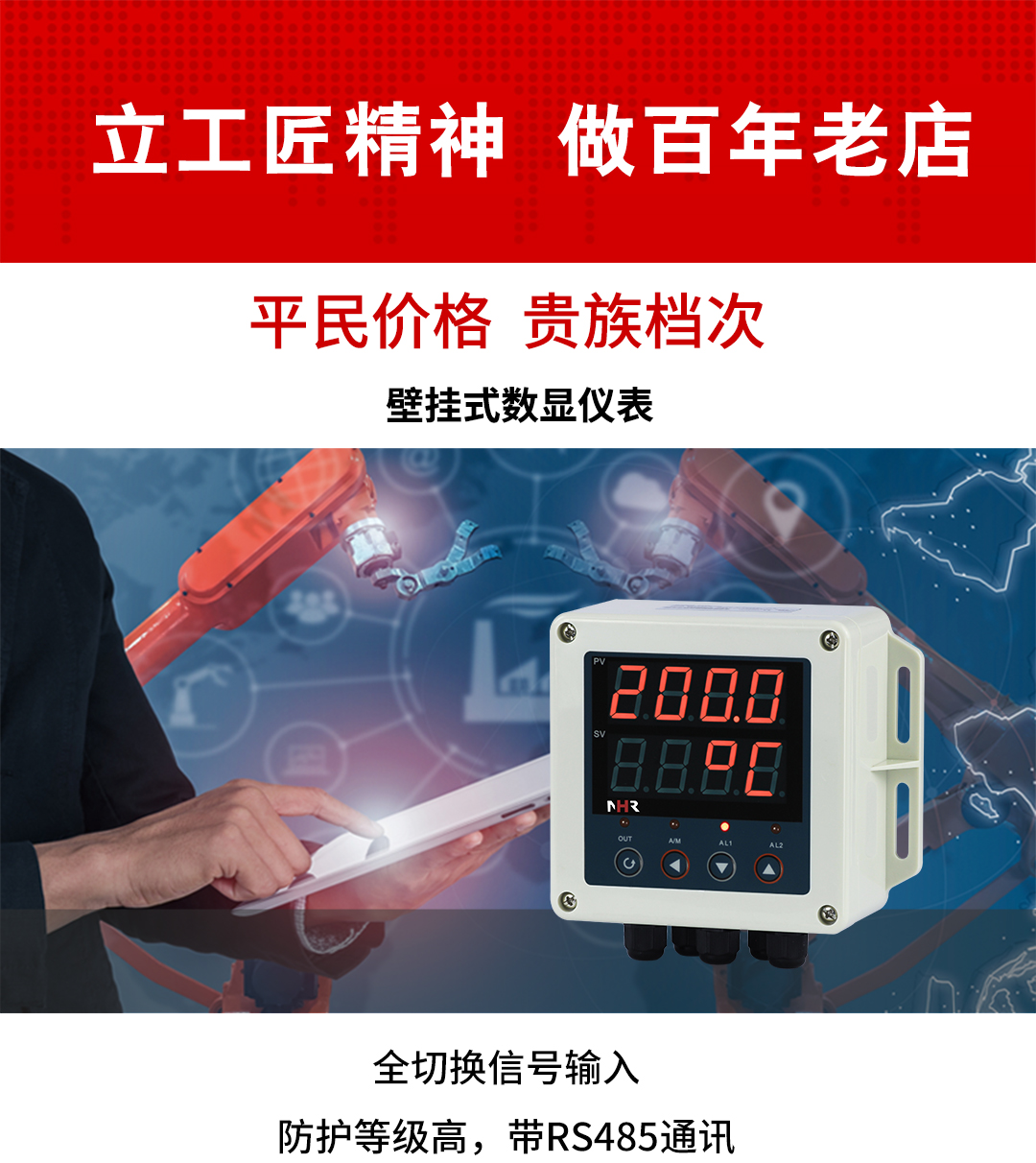 虹潤(rùn)公司是專(zhuān)業(yè)生產(chǎn)數(shù)顯表的國(guó)家專(zhuān)精特新“小巨人”企業(yè),生產(chǎn)的壁掛式數(shù)顯儀表,具有全切換信號(hào)輸入,高抗干擾,IP65防護(hù)等級(jí),全隔離設(shè)計(jì),變送輸出或RS485通訊等特點(diǎn)。產(chǎn)品獲得巡回檢測(cè)顯示方法及裝置、工業(yè)模塊的導(dǎo)軌式安裝結(jié)構(gòu)等2項(xiàng)國(guó)家發(fā)明專(zhuān)利,主持起草工業(yè)過(guò)程控制系統(tǒng)用模擬輸入兩位或多位輸出儀表、物聯(lián)網(wǎng)智能溫度儀表通用技術(shù)條件等2項(xiàng)國(guó)家標(biāo)準(zhǔn),,以及通信系統(tǒng)多通道數(shù)據(jù)采集控制終端規(guī)范軍用標(biāo)準(zhǔn),參與國(guó)際5G標(biāo)準(zhǔn)制定,取得簡(jiǎn)易數(shù)顯儀表等3項(xiàng)相關(guān)軟件著作權(quán)。產(chǎn)品廣泛應(yīng)用于電力、石化、冶金、化工、造紙、食品、輕工、制藥、熱處理、水處理、機(jī)械配套等各種工業(yè)現(xiàn)場(chǎng)。