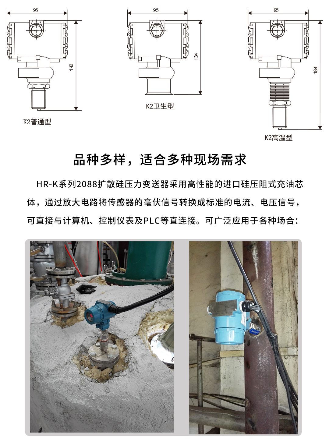 虹潤(rùn)公司是專(zhuān)業(yè)生產(chǎn)壓力變送器的國(guó)家專(zhuān)精特新“小巨人”企業(yè),生產(chǎn)的擴(kuò)散硅壓力變送器,具有精度高,穩(wěn)定性好,響應(yīng)速度快,高可靠性,抗過(guò)載和抗沖擊能力強(qiáng),安裝方便等特點(diǎn)。產(chǎn)品獲得一種數(shù)字顯示低功耗壓力表、一種信號(hào)發(fā)生器裝置等2項(xiàng)國(guó)家發(fā)明專(zhuān)利,主持起草工業(yè)過(guò)程控制系統(tǒng)用模擬輸入兩位或多位輸出儀表、工業(yè)過(guò)程測(cè)量和控制系統(tǒng)用壓力/差壓變送器等2項(xiàng)國(guó)家標(biāo)準(zhǔn),通信系統(tǒng)多通道數(shù)據(jù)采集控制終端規(guī)范軍用標(biāo)準(zhǔn),以及現(xiàn)場(chǎng)設(shè)備集成等5項(xiàng)智能制造國(guó)家標(biāo)準(zhǔn)。參與國(guó)際5G標(biāo)準(zhǔn)制定,取得數(shù)顯壓力表等2項(xiàng)相關(guān)軟件著作權(quán)。產(chǎn)品廣泛應(yīng)用于化工、食品、制藥、電力、設(shè)備配套、供暖、水處理、樓宇等行業(yè),需精準(zhǔn)測(cè)量流體壓力的現(xiàn)場(chǎng)。