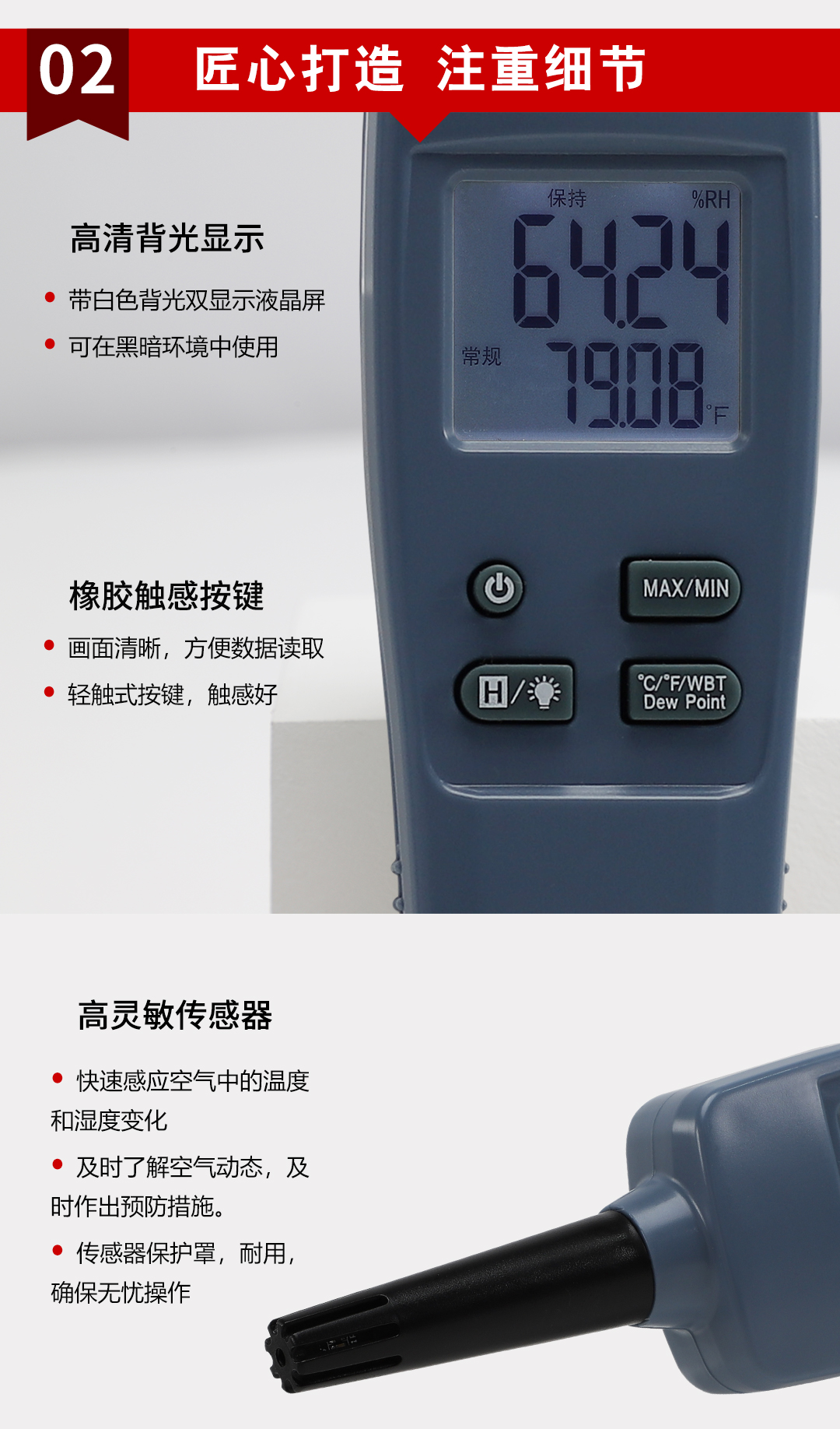 虹潤公司是專業(yè)生產(chǎn)環(huán)境監(jiān)測儀表的國家專精特新“小巨人”企業(yè)。生產(chǎn)的手持式溫濕度檢測儀,具有測量精度高,多參數(shù)測量,最大最小值記錄,小巧便捷、低功耗省電設(shè)計等特點。產(chǎn)品獲得一種手持式低功耗溫濕度檢測儀、大屏幕溫濕度記錄儀等2項國家發(fā)明專利,主持起草物聯(lián)網(wǎng)智能溫度儀表通用技術(shù)條件、冷鏈溫度記錄儀等2項國家標(biāo)準(zhǔn),以及通信系統(tǒng)多通道數(shù)據(jù)采集控制終端規(guī)范軍用標(biāo)準(zhǔn),以及現(xiàn)場設(shè)備集成等5項智能制造國家標(biāo)準(zhǔn),參與國際5G標(biāo)準(zhǔn)制定,取得環(huán)境溫濕度測試儀等3項相關(guān)軟件著作權(quán)。產(chǎn)品廣泛應(yīng)用于實驗室、博物館、農(nóng)業(yè)大棚、生產(chǎn)車間、倉庫、配電機房等諸多領(lǐng)域。