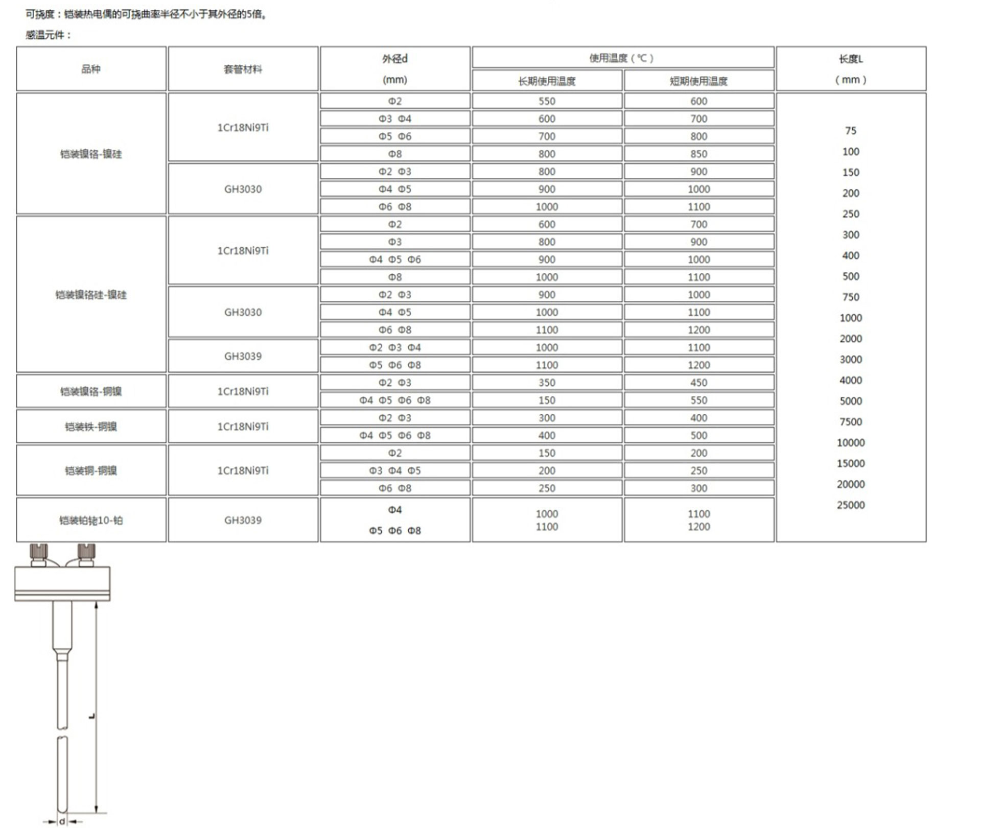 鎧裝熱電偶作為溫度測量傳感器,通常與溫度變送器、調(diào)節(jié)器及顯示儀表等配套使用,組成過程控制系統(tǒng),用以直接測量或控制各種生產(chǎn)過程中0-1800℃范圍內(nèi)的流體、蒸汽和氣體介質(zhì)以及固體表面等溫度。鎧狀熱電偶具有能彎曲、耐高壓、熱響應(yīng)時間快和堅固耐用等許多優(yōu)點。