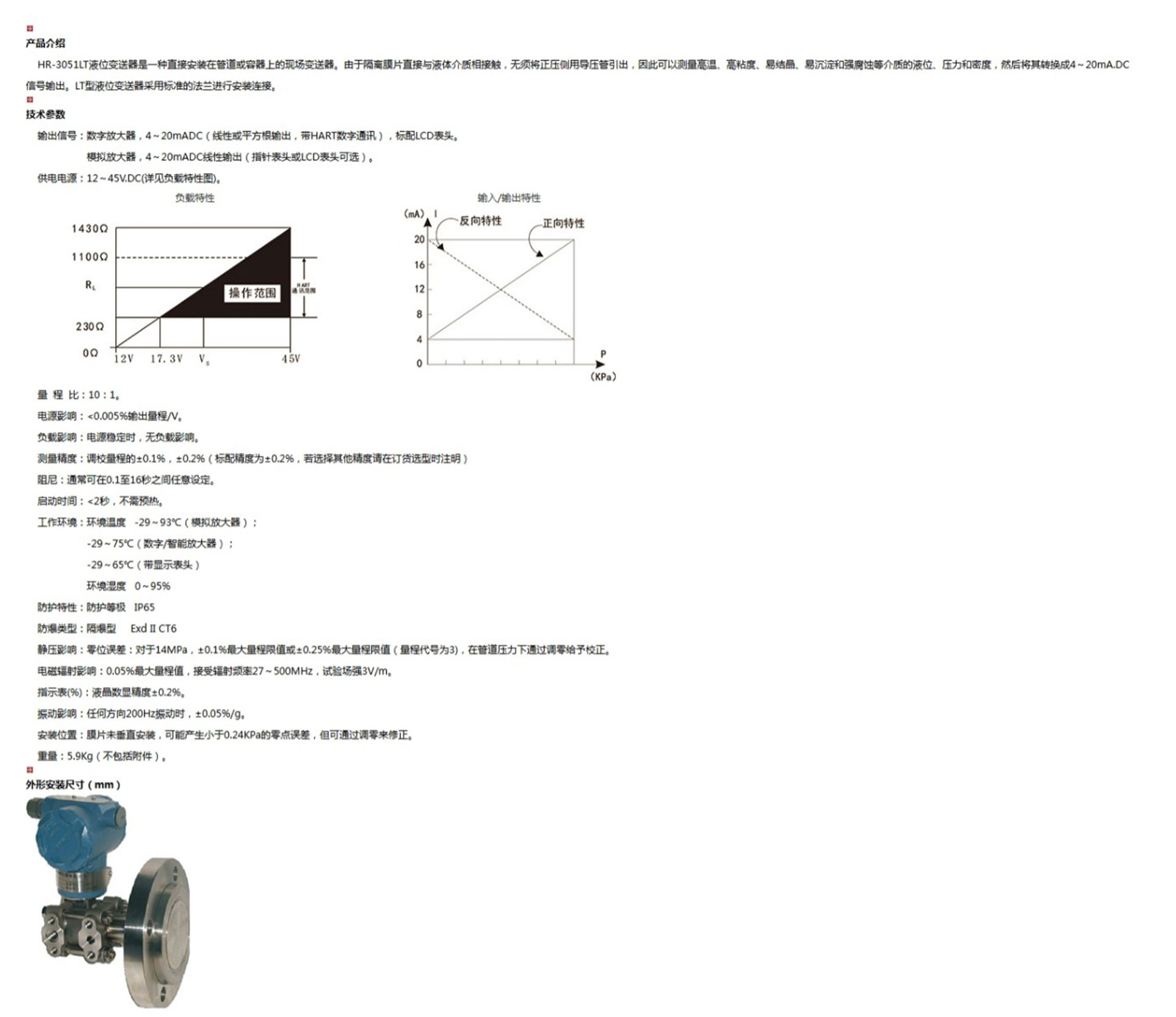 HR-3051LT液位變送器是一種直接安裝在管道或容器上的現(xiàn)場變送器。由于隔離膜片直接與液體介質(zhì)相接觸,無須將正壓側(cè)用導(dǎo)壓管引出,因此可以測量高溫、高粘度、易結(jié)晶、易沉淀和強(qiáng)腐蝕等介質(zhì)的液位、壓力和密度,然后將其轉(zhuǎn)換成4~20mA.DC信號輸出。