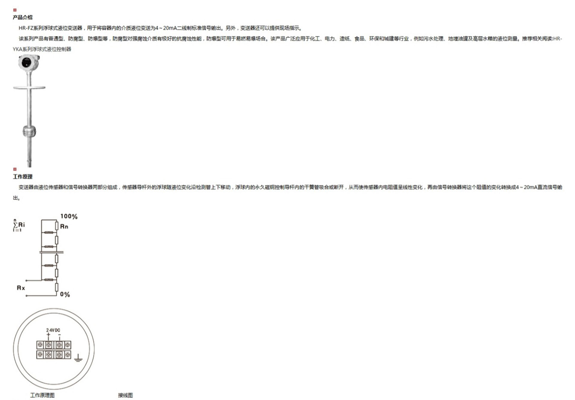 HR-FZ系列浮球式液位變送器,用于將容器內的介質液位變送為4~20mA二線制標準信號輸出。另外,變送器還可以提供現(xiàn)場指示。